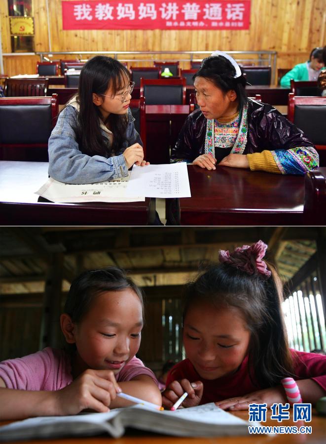 這是一張拼版照片,上圖為:2020年4月1日,在烏英苗寨“雙語雙向”培訓班課堂上,大一學生潘木枝(左)在教媽媽講普通話(新華社記者黃孝邦攝);下圖為:2010年5月27日,在烏英教學點,二年級學生潘木枝(左)在課堂上學習(龍濤攝)。新華社發(fā)