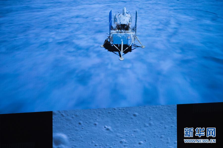 2020年12月1日23時11分,嫦娥五號探測器成功著陸在月球正面西經(jīng)51.8度、北緯43.1度附近的預選著陸區(qū),并傳回著陸影像圖。這是在北京航天飛行控制中心拍攝的嫦娥五號探測器落月瞬間。新華社記者 金立旺 攝