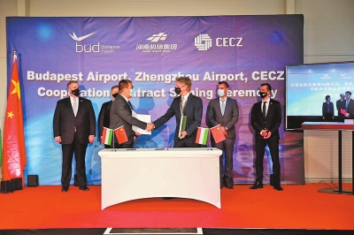 圖為河南機(jī)場(chǎng)集團(tuán)、布達(dá)佩斯機(jī)場(chǎng)在布達(dá)佩斯簽訂戰(zhàn)略合作協(xié)議。受訪單位供圖