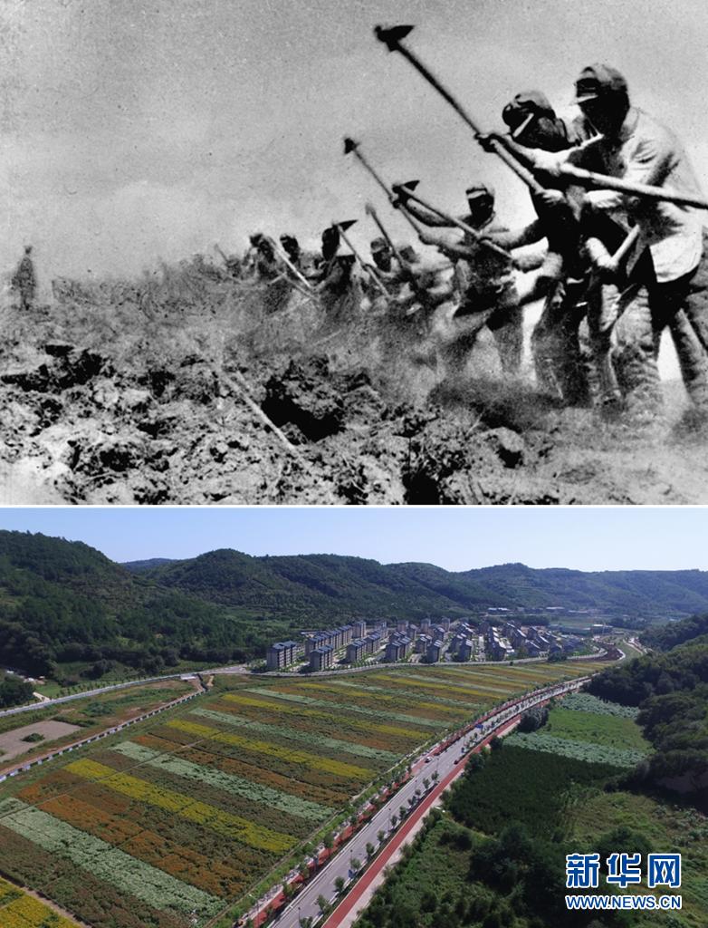 這是一張拼版照片,上圖為:抗日戰(zhàn)爭期間,八路軍三五九旅在南泥灣開荒生產(chǎn)(資料照片,新華社發(fā));下圖為:2020年8月25日拍攝的延安南泥灣景色(無人機照片,祁小軍攝)。新華社發(fā)