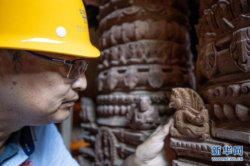 2019年10月10日,在尼泊爾加德滿都杜巴廣場(chǎng),中國(guó)派出的文物修復(fù)隊(duì)技術(shù)主管周建國(guó)在九層神廟修復(fù)現(xiàn)場(chǎng)查看一個(gè)修復(fù)好的文物。新華社記者 王婧嬙 攝