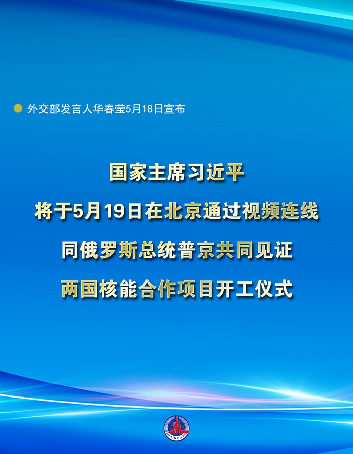 新華社北京5月18日電 外交部發(fā)言人華春瑩18日宣布:國(guó)家主席習(xí)近平將于5月19日在北京通過(guò)視頻連線,同俄羅斯總統(tǒng)普京共同見證兩國(guó)核能合作項(xiàng)目開工儀式。