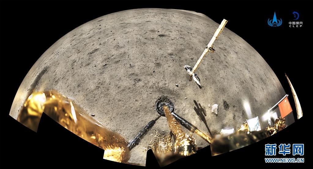 2020年12月4日,國家航天局公布了探月工程嫦娥五號探測器在月球表面國旗展示的照片。嫦娥五號著陸器和上升器組合體全景相機(jī)環(huán)拍成像,五星紅旗在月面成功展開,此外圖像上方可見已完成表取采樣的機(jī)械臂及采樣器。新華社發(fā)(國家航天局供圖)