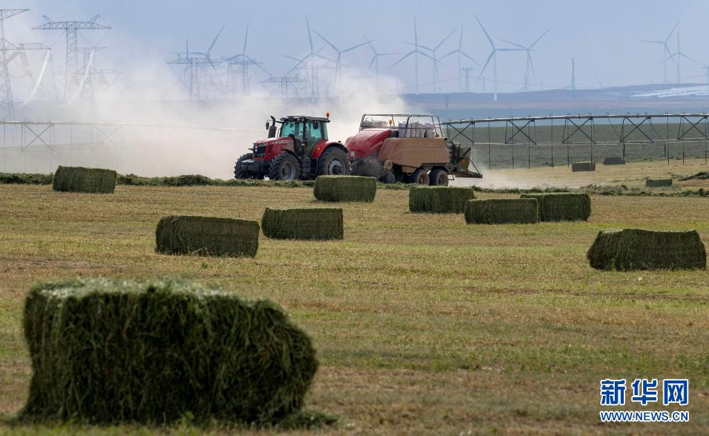 在寧夏鹽池縣馮記溝鄉(xiāng)平臺村的優(yōu)質(zhì)牧草基地,農(nóng)戶用機(jī)械將牧草打捆(7月14日攝)。新華社記者 楊植森 攝