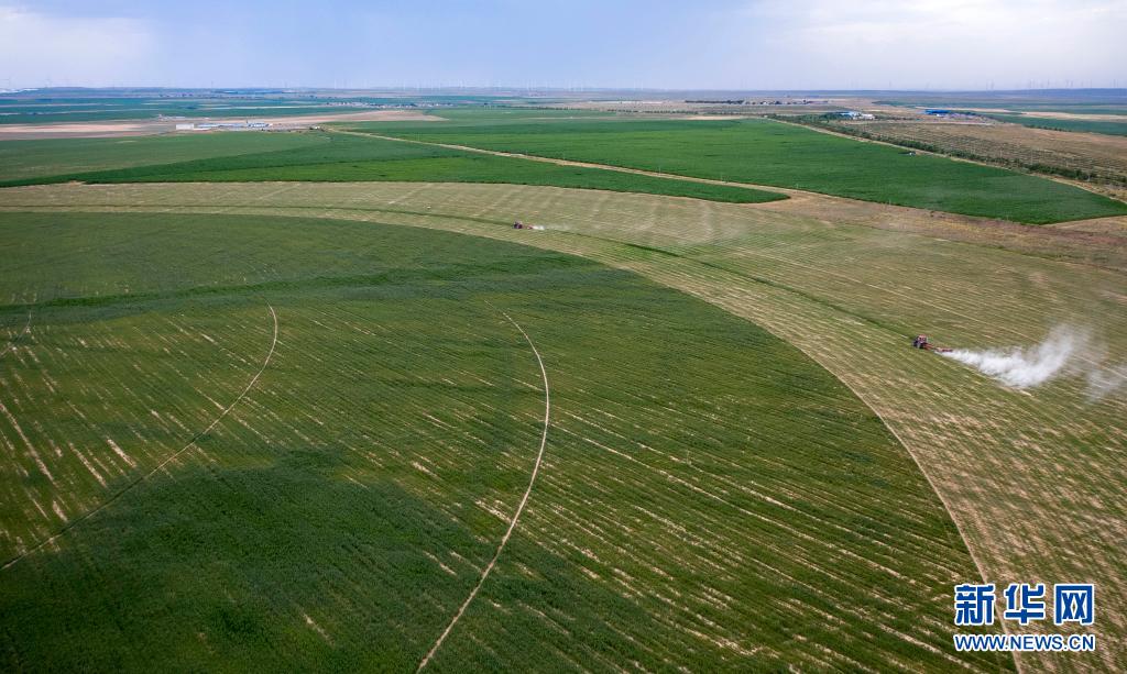 在寧夏鹽池縣馮記溝鄉(xiāng)平臺村的優(yōu)質(zhì)牧草基地,農(nóng)戶用機(jī)械收割牧草(無人機(jī)照片,7月14日攝)。新華社記者 楊植森 攝