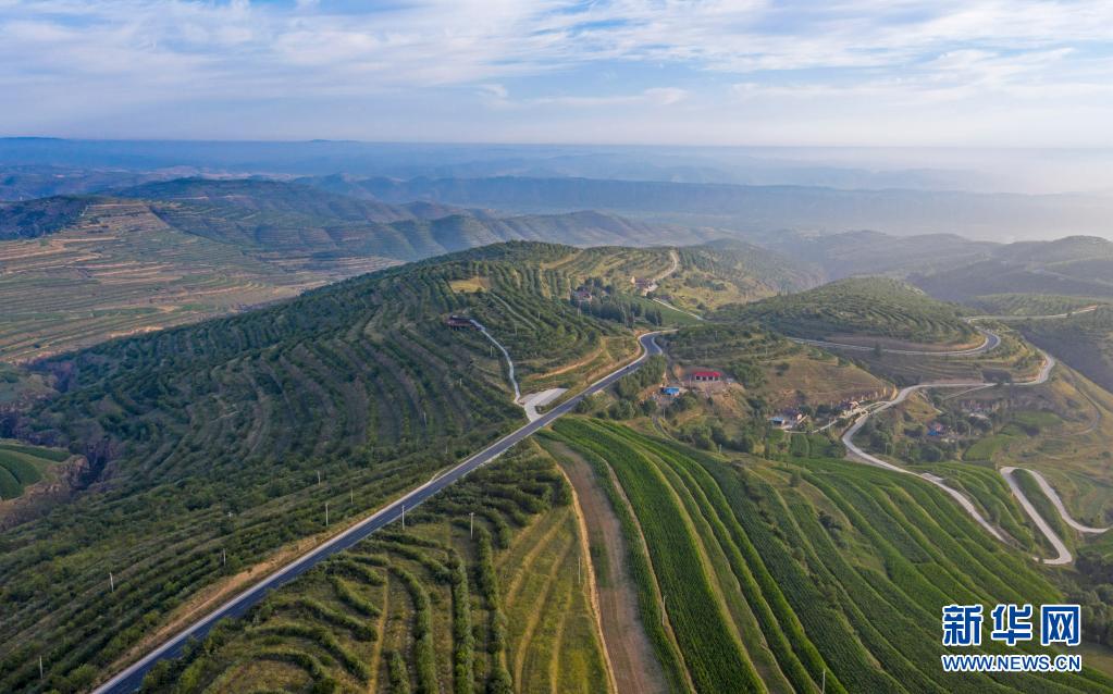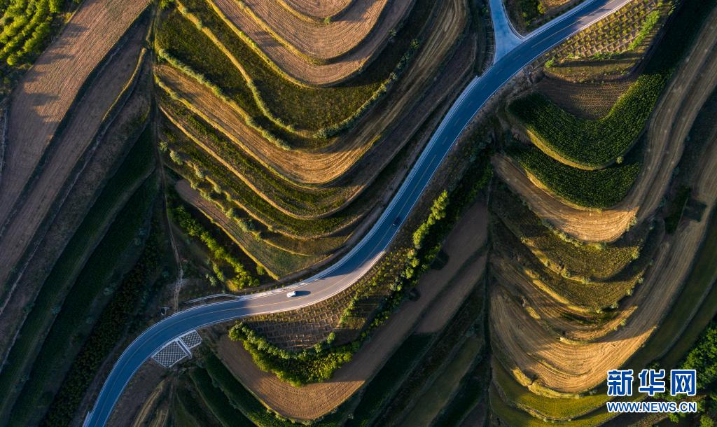 這是7月14日在寧夏固原市彭陽縣拍攝的青云灣旱作梯田公園(無人機(jī)照片)。新華社記者 馮開華 攝
