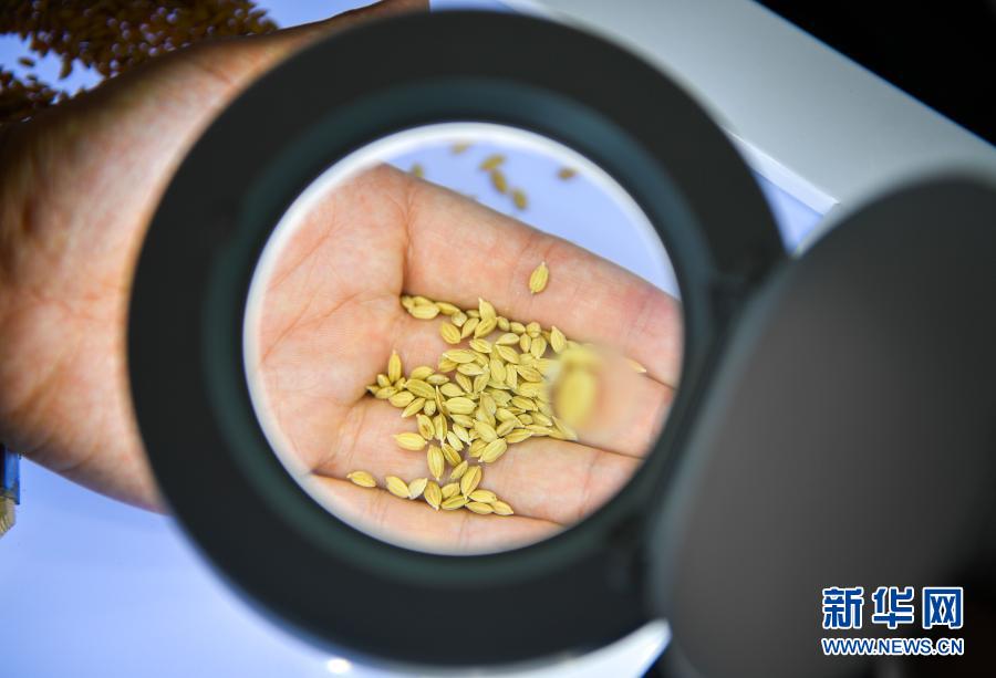 在吉林省吉林市永吉縣一拉溪鎮(zhèn)九月豐家庭農(nóng)場,工作人員在實驗室中檢測一批試種水稻的稻谷外觀(8月12日攝)。新華社記者 許暢 攝