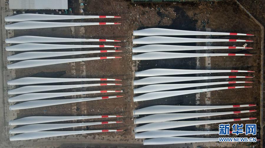 這是河北省威縣一家風電設施生產(chǎn)企業(yè)內的大型風電機組葉片(12月8日攝,無人機照片)。新華社記者 牟宇 攝