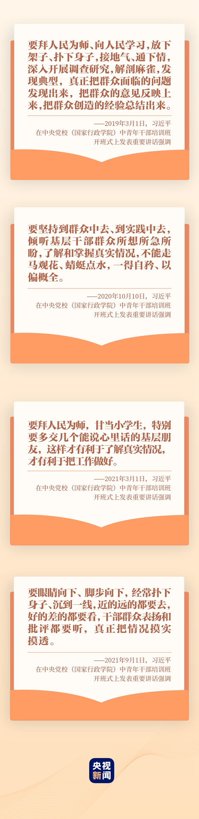 “堅(jiān)持從群眾中來、到群眾中去,真正成為群眾的貼心人” “既要‘身入’基層,更要‘心到’基層”“掌握調(diào)查研究這個(gè)基本功”……2019年以來,習(xí)近平總書記在中青年干部培訓(xùn)班開班式上多次要求干部拜人民為師,深入基層開展調(diào)查研究。
