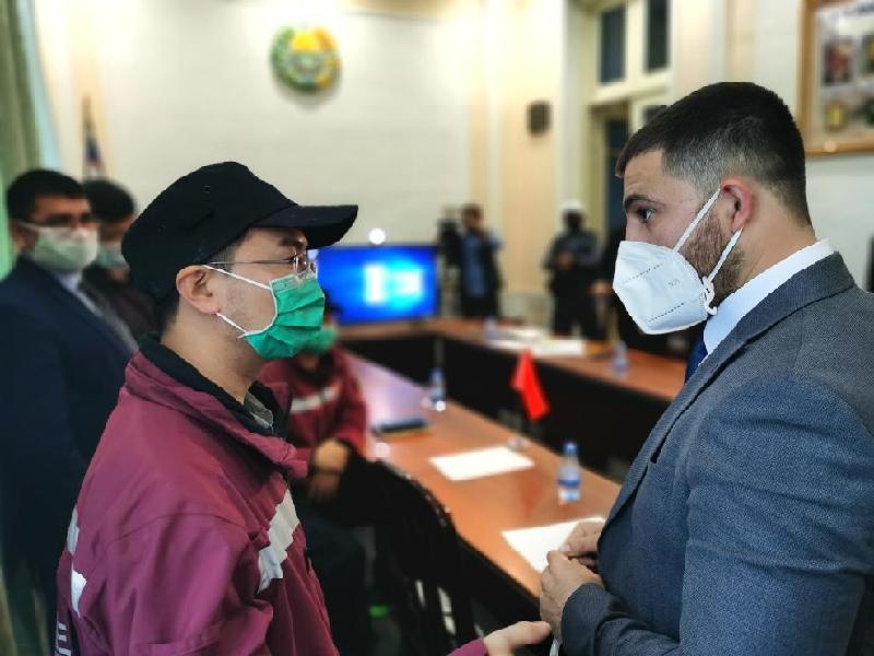 2020年4月20日,在烏茲別克斯坦費爾干納州,肯熱巴耶夫(右)與中國政府聯(lián)合醫(yī)療工作組成員交流。