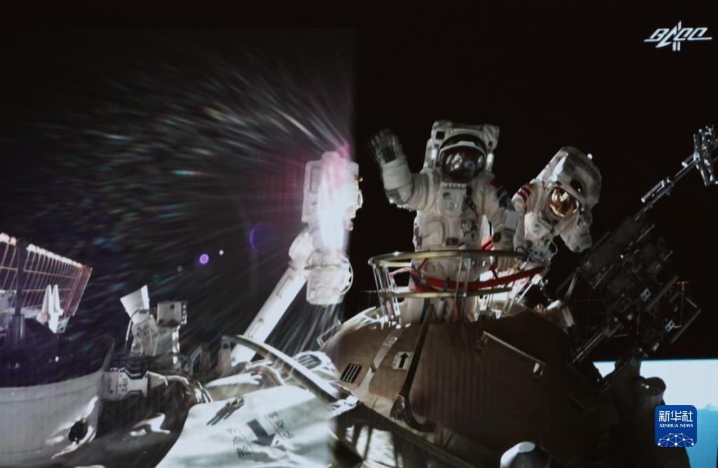 8月20日在北京航天飛行控制中心大屏拍攝的神舟十二號乘組航天員聶海勝、劉伯明在出艙任務(wù)結(jié)束后揮手示意。新華社記者 田定宇 攝