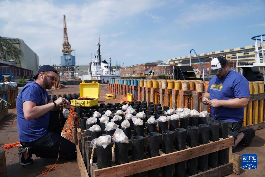 2019年5月25日,工作人員在美國(guó)賓夕法尼亞州費(fèi)城一處碼頭安裝產(chǎn)自中國(guó)湖南瀏陽的煙花,為當(dāng)晚美國(guó)陣亡將士紀(jì)念日的煙花表演做準(zhǔn)備。新華社記者 劉杰 攝