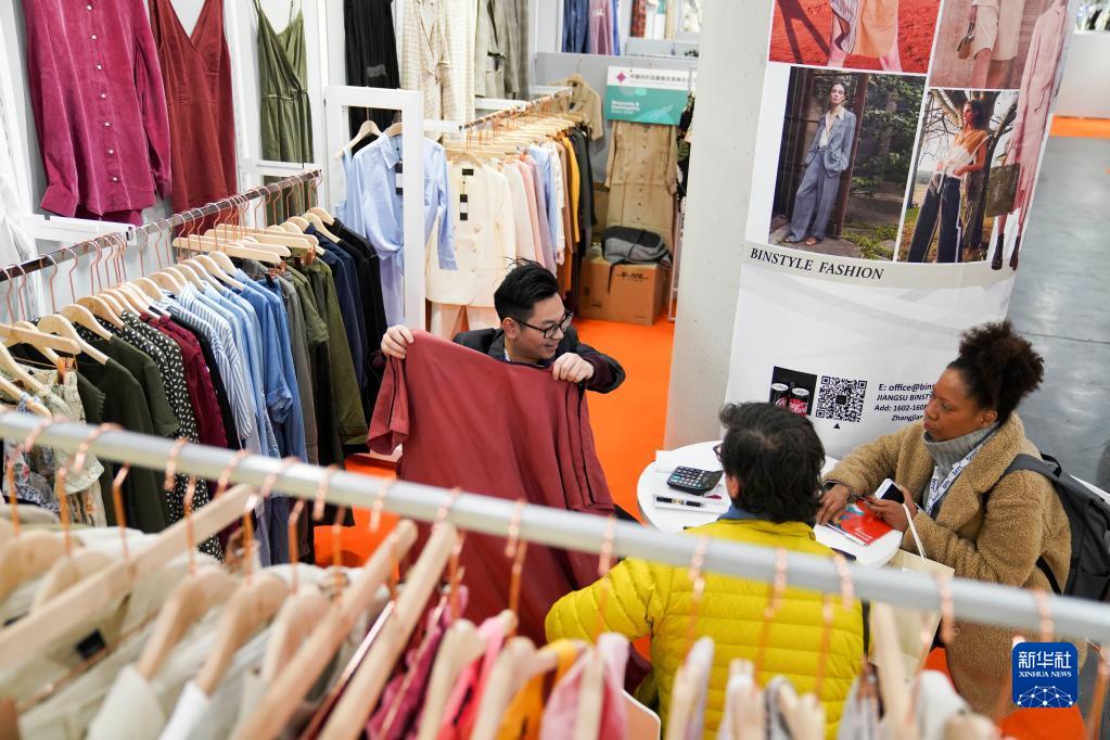 2020年1月21日,在美國(guó)紐約舉行的第二十一屆中國(guó)紡織品服裝貿(mào)易展覽會(huì)(紐約)春季展上,江蘇一家企業(yè)的工作人員(左)為訪客介紹產(chǎn)品。新華社記者 王迎 攝