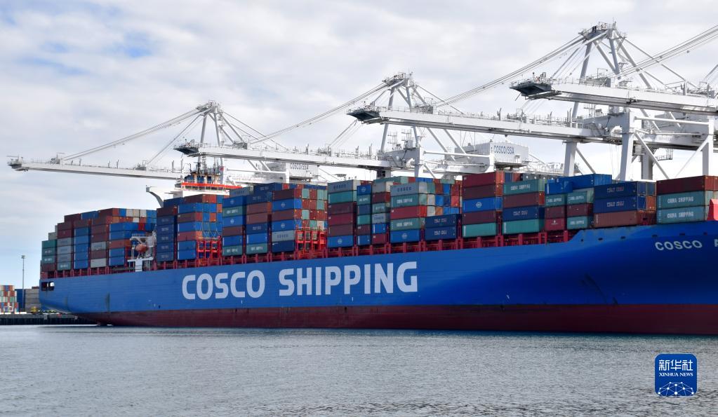 這是2019年2月27日在長(zhǎng)灘港拍攝的一艘中國(guó)遠(yuǎn)洋運(yùn)輸集團(tuán)(COSCO)的集裝箱貨輪。新華社記者 李穎 攝