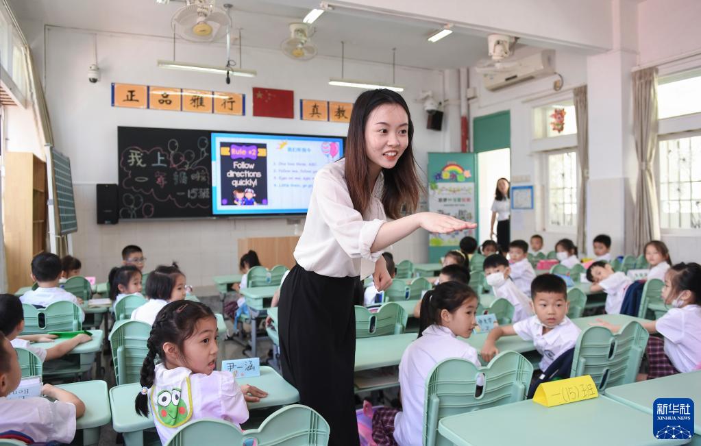 深圳市福田區(qū)南園小學(xué)教師、香港理工大學(xué)對外漢語教育專業(yè)碩士畢業(yè)的香港青年黃曉蕾在英語課上與孩子們互動(dòng)(9月1日攝)。新華社記者 毛思倩 攝