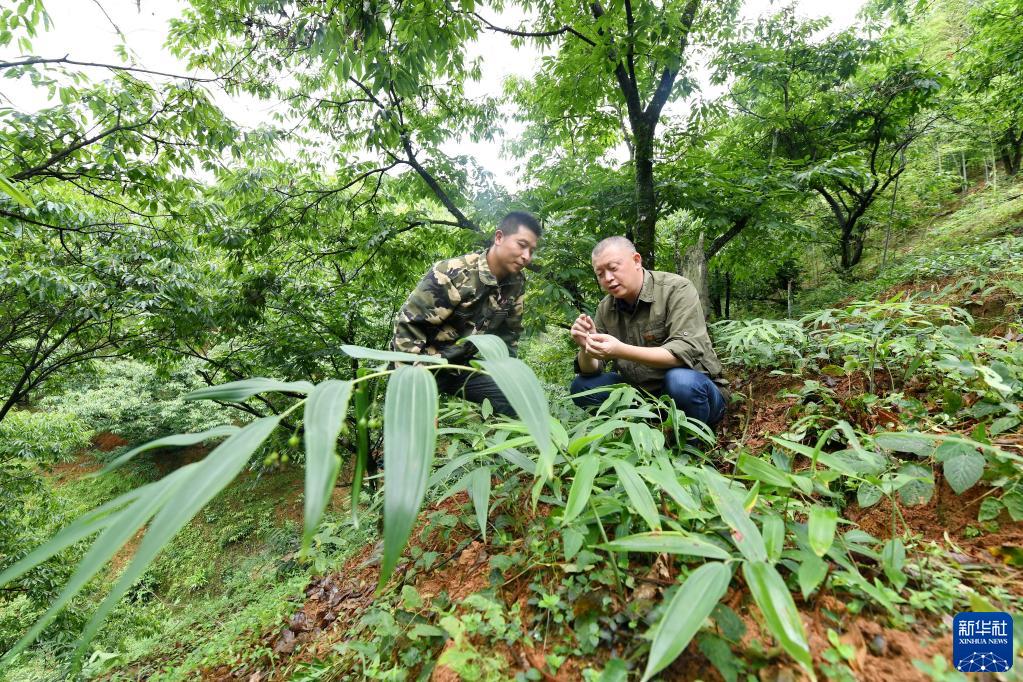 福建建甌市林權(quán)改革發(fā)展服務(wù)中心的科技特派員陳國興(右)在建甌市玉山鎮(zhèn)上房村一處林下種植園給村民講授中藥材栽培方法(5月28日攝)。新華社記者 林善傳 攝