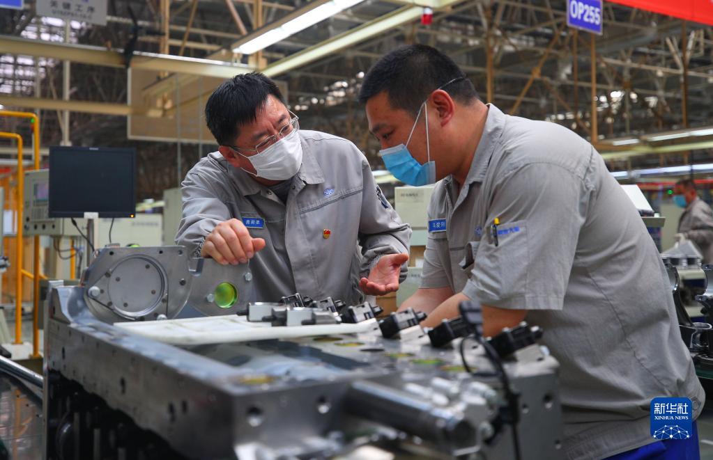 一汽解放大連柴油機(jī)有限公司的高級(jí)技師鹿新弟(左)在車間與同事交流(2020年5月7日攝)。新華社記者 龍雷 攝