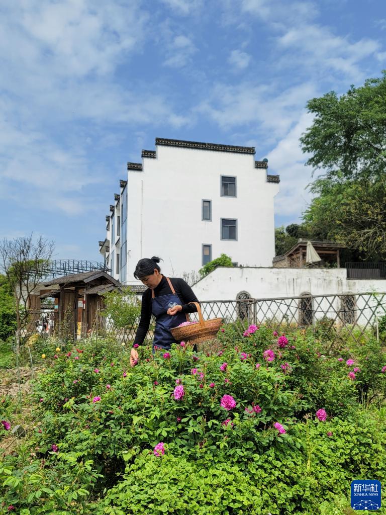 4月19日,張建玲在位于安徽省黃山市徽州區(qū)的民宿院子里采摘食用玫瑰花。新華社發(fā)