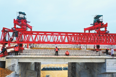 大別山革命老區(qū)引淮供水灌溉工程樞紐工程節(jié)制閘交通橋安全架設完成。 譚勇 李自洲 攝