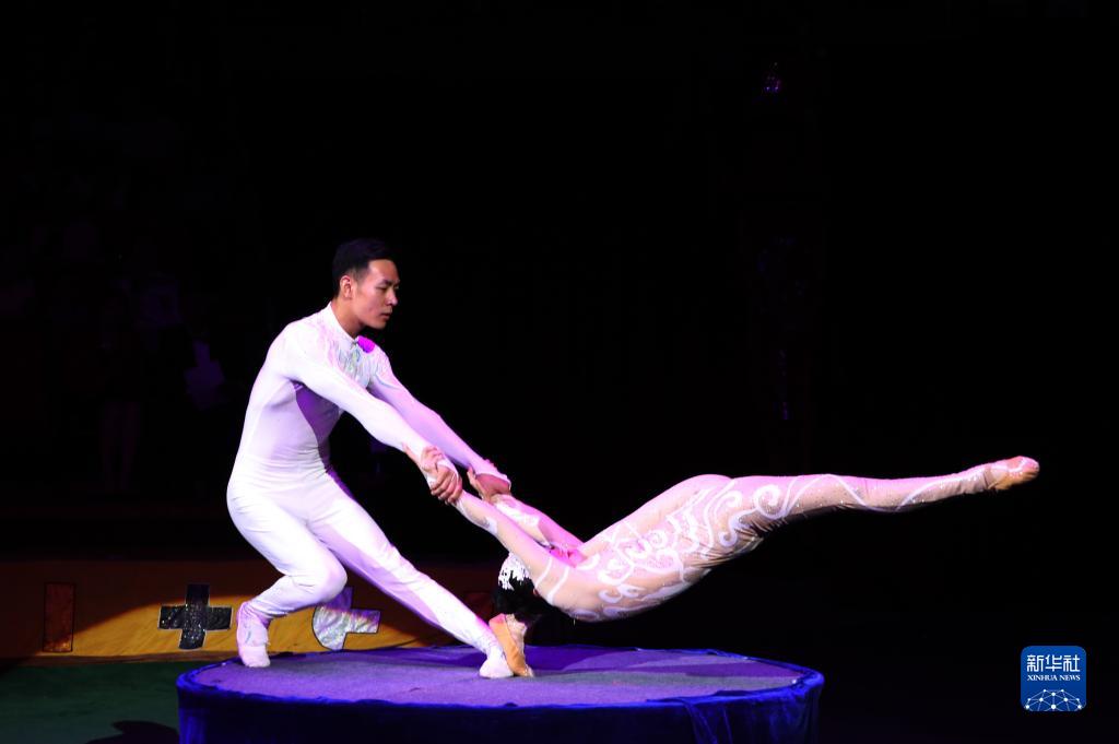 2019年9月4日,在蒙古國(guó)首都烏蘭巴托,中國(guó)河北省滄州市雜技團(tuán)演員表演雜技。新華社發(fā)(蘇力雅 攝)