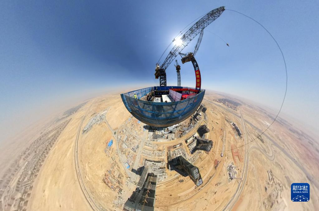 這是2021年6月17日在埃及開羅附近拍攝的埃及新行政首都中央商務(wù)區(qū)標(biāo)志塔(全景相機拍攝)。埃及新行政首都中央商務(wù)區(qū)位于首都開羅以東約50公里處,由中國建筑股份有限公司埃及分公司承建。新華社記者 隋先凱 攝