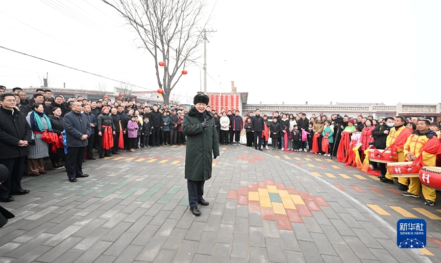 村文化廣場(chǎng)上十分熱鬧,村民們打起威風(fēng)鑼鼓、扭起秧歌歡慶佳節(jié)??吹娇倳泚砹耍藗兏吲d地歡呼起來。習(xí)近平對(duì)鄉(xiāng)親們說,我們黨的根本宗旨就是為人民群眾辦好事,為人民群眾幸福生活拼搏、奉獻(xiàn)、服務(wù)。我們?nèi)缙诖蜈A了脫貧攻堅(jiān)戰(zhàn),如期實(shí)現(xiàn)了全面建成小康社會(huì)目標(biāo),現(xiàn)在踏上了全面建設(shè)社會(huì)主義現(xiàn)代化國家新征程。建設(shè)現(xiàn)代化國家離不開農(nóng)業(yè)農(nóng)村現(xiàn)代化,要繼續(xù)鞏固脫貧攻堅(jiān)成果,扎實(shí)推進(jìn)鄉(xiāng)村振興,讓群眾生活更上一層樓,在推進(jìn)農(nóng)業(yè)農(nóng)村現(xiàn)代化中越走越有奔頭。