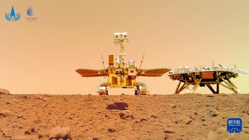 這是“著巡合影”圖。2021年6月11日,國(guó)家航天局在北京舉行天問(wèn)一號(hào)探測(cè)器著陸火星首批科學(xué)影像圖揭幕儀式,公布了由祝融號(hào)火星車拍攝的著陸點(diǎn)全景、火星地形地貌、“中國(guó)印跡”和“著巡合影”等影像圖。首批科學(xué)影像圖的發(fā)布,標(biāo)志著我國(guó)首次火星探測(cè)任務(wù)取得圓滿成功。新華社發(fā)(國(guó)家航天局供圖)