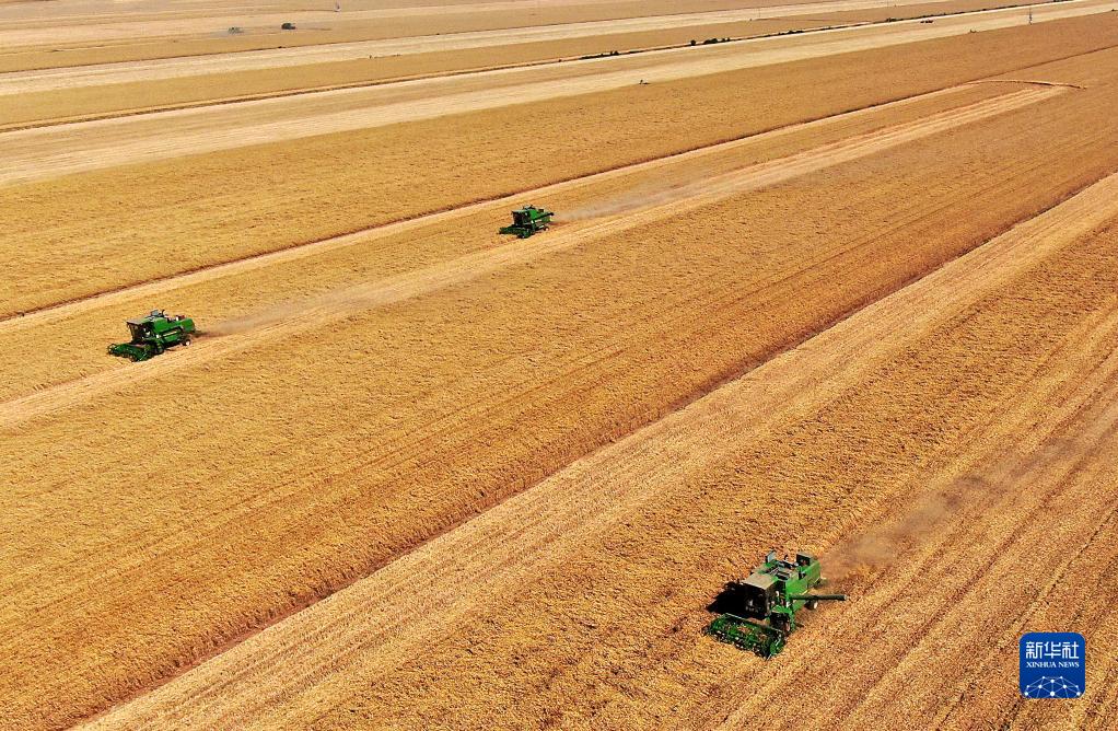在河南省黃泛區(qū)農(nóng)場(chǎng)九分場(chǎng)的麥田里,農(nóng)機(jī)手操作收割機(jī)收獲小麥(無(wú)人機(jī)照片,2021年6月6日攝)。新華社記者 李安 攝