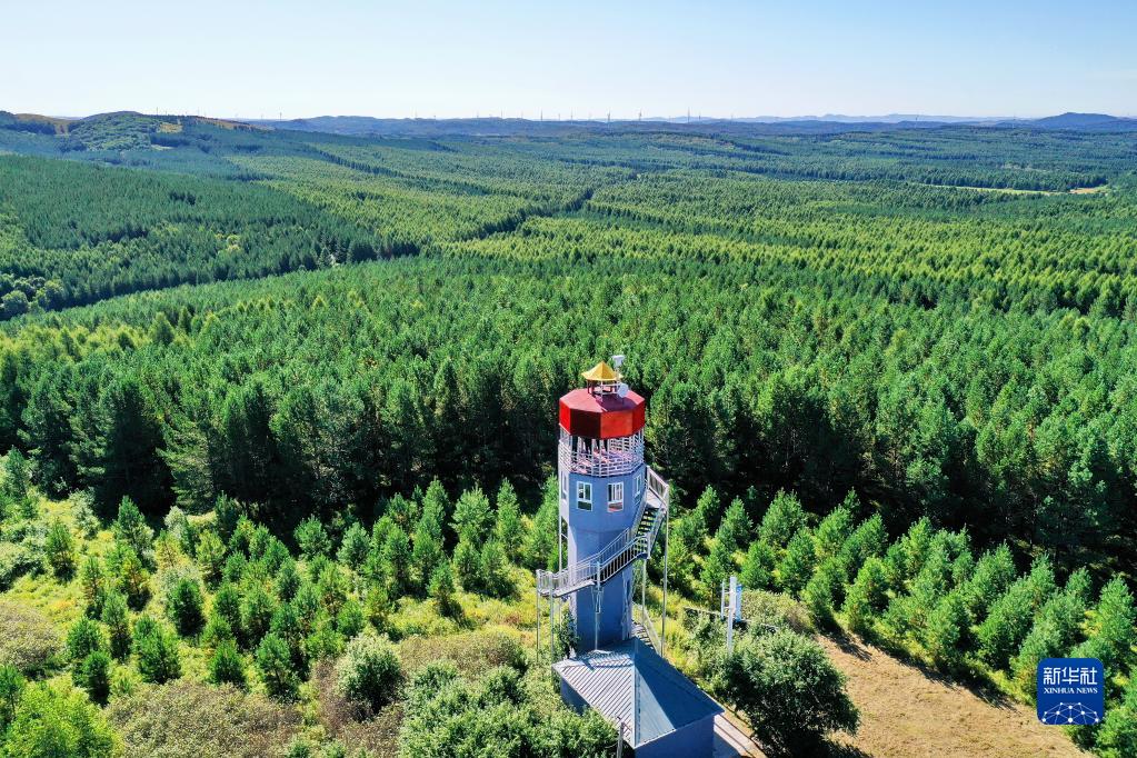 河北塞罕壩機(jī)械林場(chǎng)內(nèi)的望海樓(2021年8月23日攝,無(wú)人機(jī)照片)。新華社記者 牟宇 攝