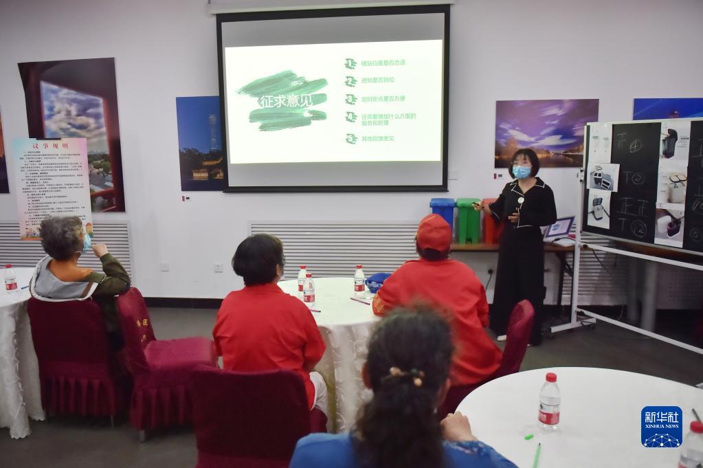 在北京建國門街道趙家樓社區(qū)議事廳舉行的“兩桶一袋”居民征求意見懇談會上,來自社區(qū)的12位垃圾分類達(dá)人對“兩桶”款式進(jìn)行投票選擇,同時(shí),街道針對桶站位置、定時(shí)定點(diǎn)投放等垃圾分類運(yùn)營管理聽取居民意見(2020年5月2日攝)。新華社記者 彭子洋 攝