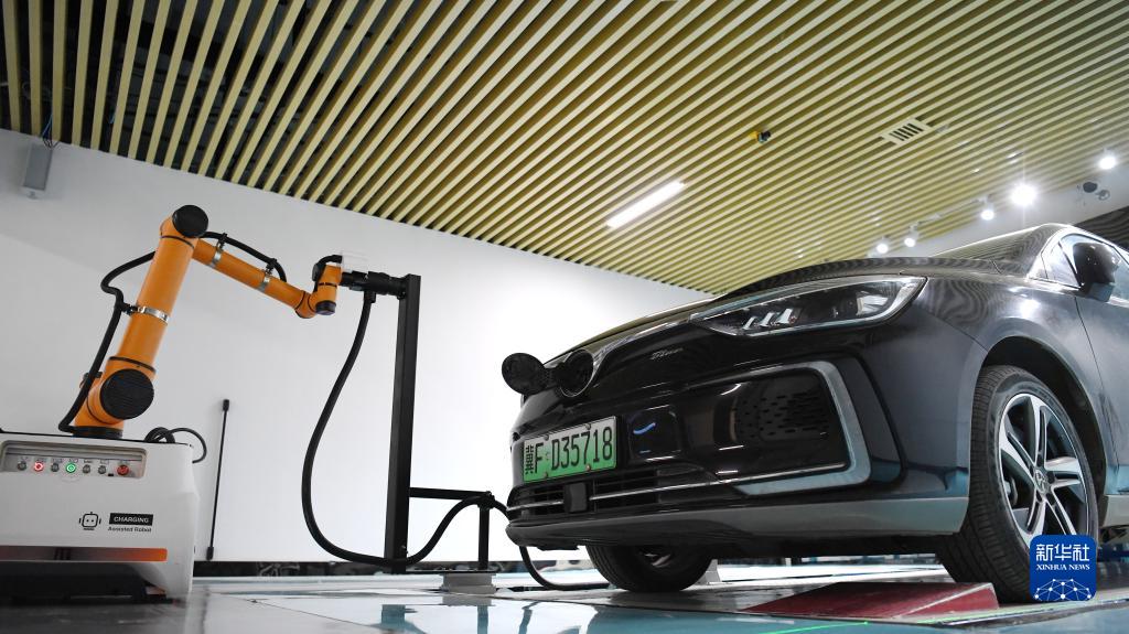在雄安新區(qū)劇村變電站智慧充電區(qū),插拔槍機器人為一輛電動汽車充電(3月18日攝)。新華社記者 朱旭東 攝