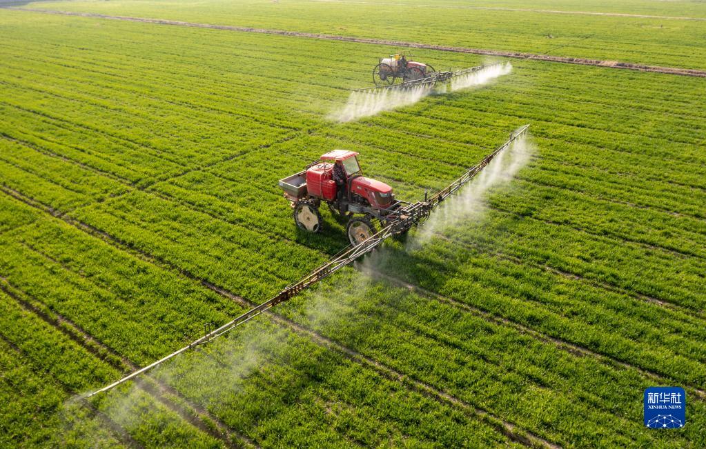 在江蘇省海安市大公鎮(zhèn)賁集村,村民駕駛植保機(jī)械在小麥田間進(jìn)行噴灑藥物作業(yè)(3月9日攝,無人機(jī)照片)。新華社發(fā)(翟慧勇 攝)