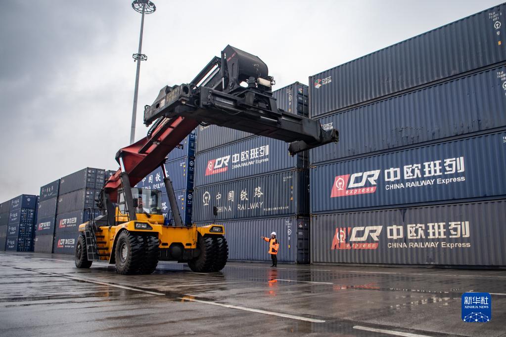 中歐班列起點聯(lián)合巡邏隊成員在重慶團(tuán)結(jié)村中心站貨場對作業(yè)車輛進(jìn)行現(xiàn)場指揮(1月25日攝)。新華社記者 唐奕 攝