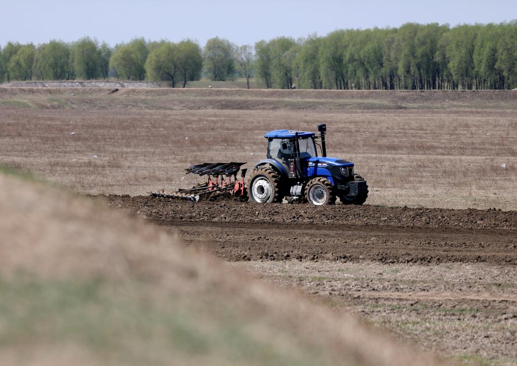 2022年4月22日,在遼寧省臺(tái)安縣達(dá)牛鎮(zhèn)十四家子村大豆基地,農(nóng)機(jī)手駕駛農(nóng)機(jī)對(duì)農(nóng)田進(jìn)行翻耕。新華社記者 姚劍鋒 攝