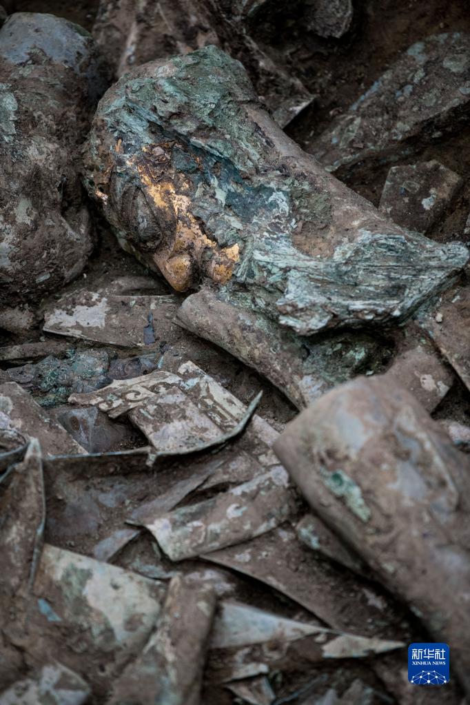 這是在三星堆遺址8號(hào)“祭祀坑”拍攝的銅神獸(6月1日攝)。新華社記者 王曦 攝