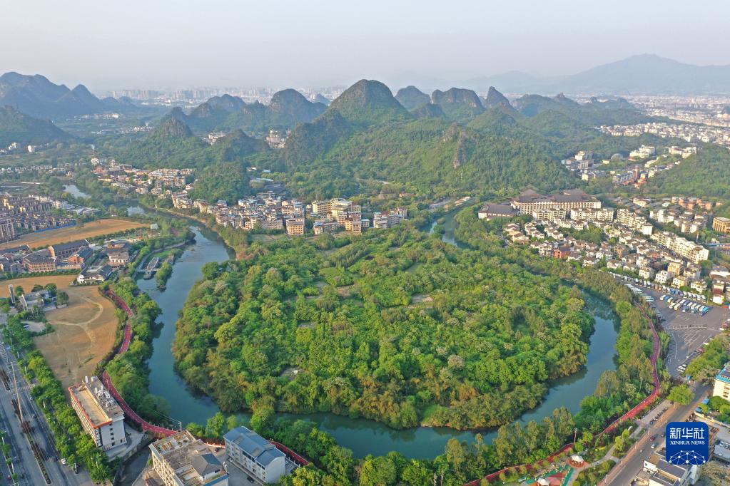廣西桂林市城區(qū)風(fēng)光(4月10日攝,無人機(jī)照片)。新華社記者 周華 攝