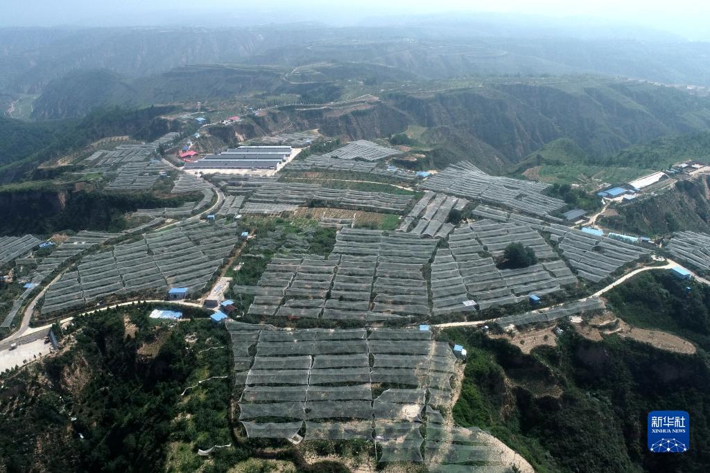 2020年7月29日拍攝的陜西省延安市延川縣梁家河村山地蘋(píng)果園(無(wú)人機(jī)照片)。 新華社記者 張博文 攝