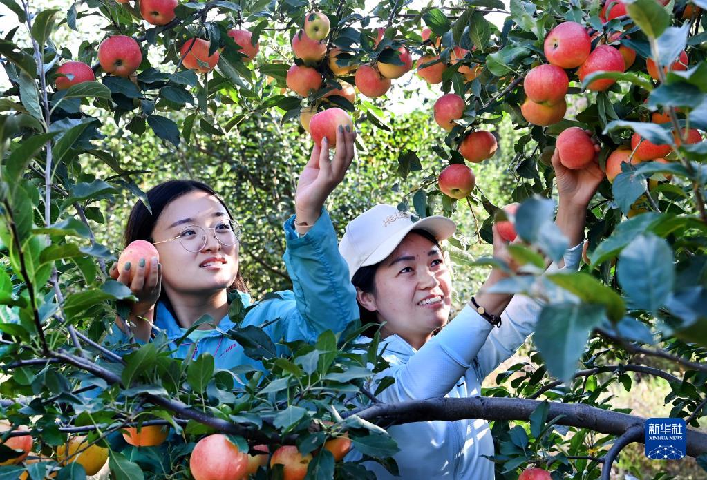 2021年9月10日,游人在陜西省榆林市米脂縣高西溝村蘋(píng)果采摘園采摘蘋(píng)果。 新華社記者 陶明 攝