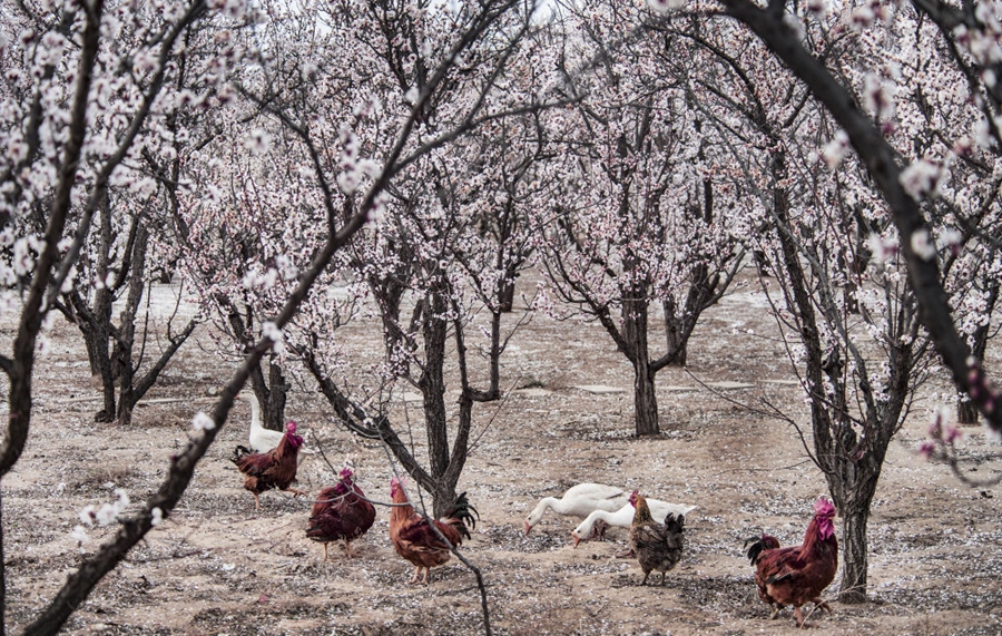 ↑一群雞鵝在陜西省榆林市榆陽區(qū)古塔鎮(zhèn)趙家茆村的杏樹林里覓食(2020年4月7日攝)。當?shù)厝罕娫诎l(fā)展杏產業(yè)的同時發(fā)展林下經濟,成效顯著。