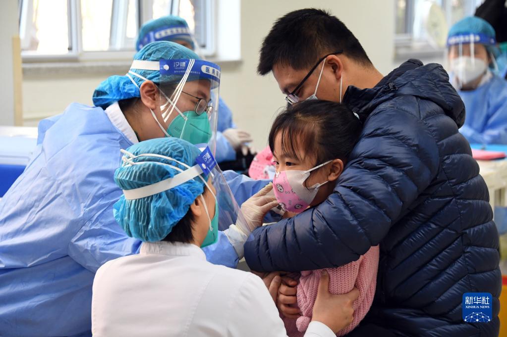 在北京市海淀區(qū)學院路街道新冠疫苗接種點,醫(yī)護人員為一名小朋友接種新冠疫苗(2021年11月13日攝)。新華社記者 任超 攝