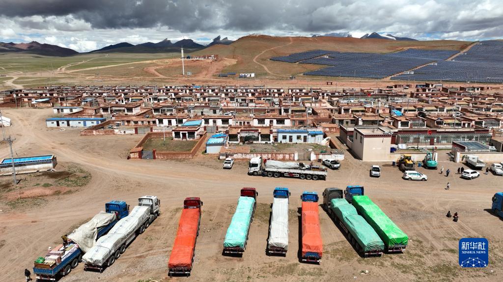 在西藏那曲市雙湖縣多瑪鄉(xiāng)仲魯瑪村,運輸家具的貨車整裝待發(fā)(2022年7月13日攝,無人機照片)。新華社記者 晉美多吉 攝