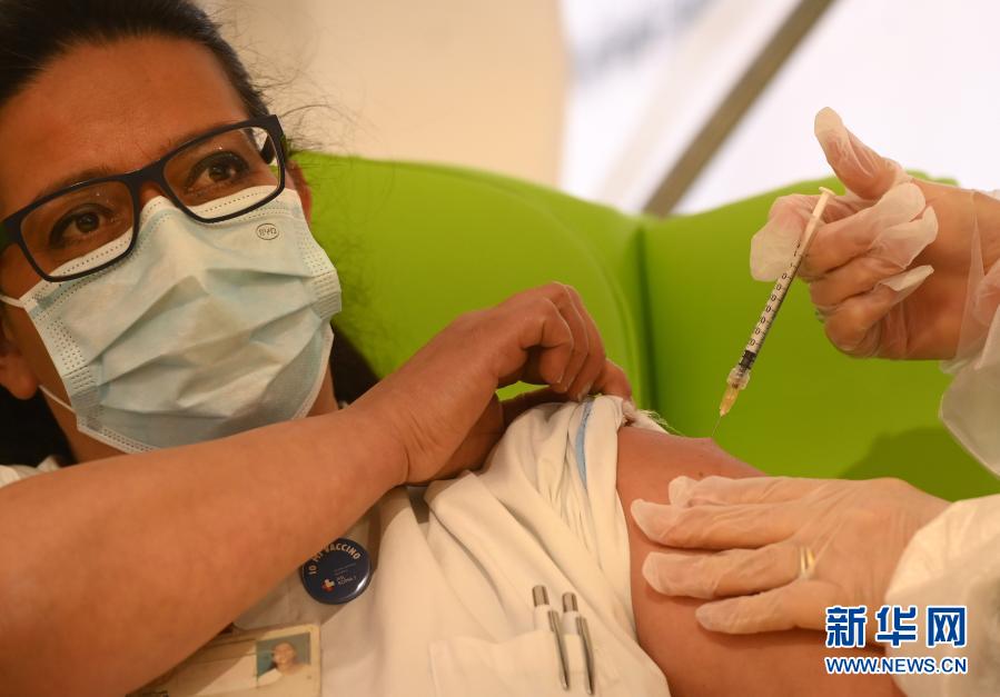 2020年12月28日,在意大利羅馬一家醫(yī)院,一名醫(yī)護(hù)人員接種由美國(guó)輝瑞制藥有限公司與德國(guó)生物新技術(shù)公司聯(lián)合研發(fā)的新冠疫苗。新華社發(fā)(阿爾貝托·林格利亞攝)