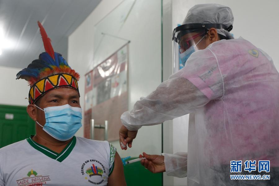 2021年1月19日,在巴西亞馬孫州塔巴廷加市,醫(yī)護(hù)人員為一名原住民接種中國(guó)新冠疫苗。新華社發(fā)(盧西奧·塔沃拉 攝)
