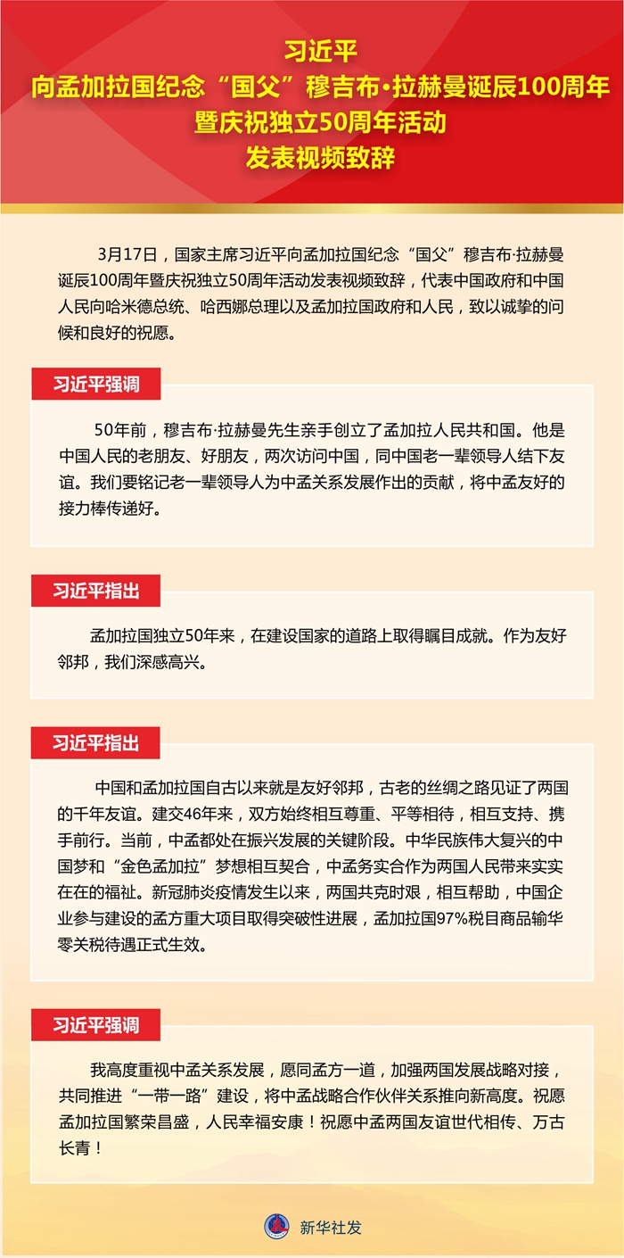 新華社北京 3 月 17 日電 3 月 17 日,國家主席習(xí)近平向孟加拉國紀念 “ 國父 ” 穆吉布 · 拉赫曼誕辰 100 周年暨慶祝獨立 50 周年活動發(fā)表視頻致辭,代表中國政府和中國人民向哈米德總統(tǒng)、哈西娜總理以及孟加拉國政府和人民,致以誠摯的問候和良好的祝愿。