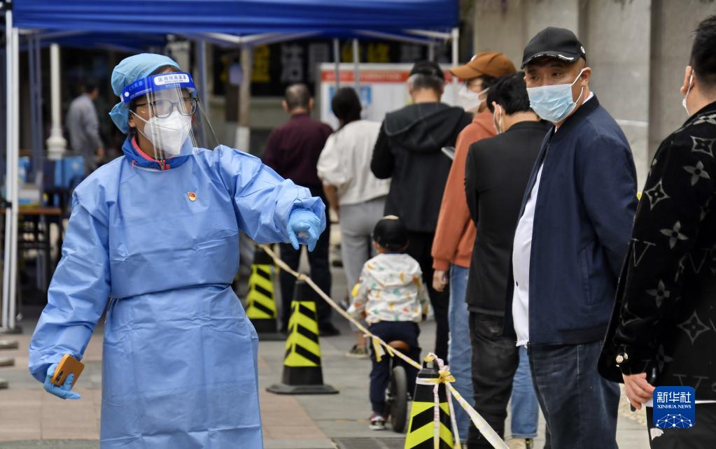 共產(chǎn)黨員、北京八里莊街道機(jī)關(guān)干部張茜(左)在核酸篩查現(xiàn)場(chǎng)進(jìn)行秩序維護(hù)(2022年5月11日攝)。新華社記者 李欣 攝