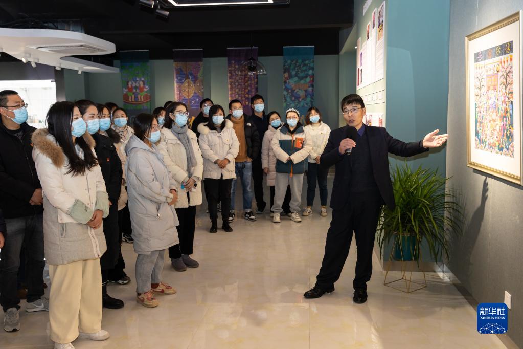 12月4日,江蘇省南京市六合區(qū)農(nóng)民畫美術(shù)館內(nèi),一場以江蘇省非物質(zhì)文化遺產(chǎn)六合農(nóng)民畫為載體的黨的二十大精神宣講會舉行。這是六合區(qū)冶山街道文體服務(wù)中心主任胡斌(右一)帶領(lǐng)參加活動的基層干部群眾參觀農(nóng)民畫。新華社發(fā) (張夢 攝
