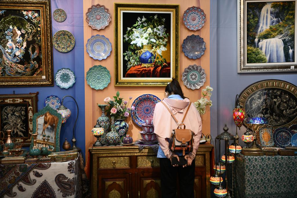 2021年9月12日,在廣西南寧國際會(huì)展中心,參觀者在東博會(huì)“一帶一路”國際展區(qū)伊朗展臺(tái)觀看展品。