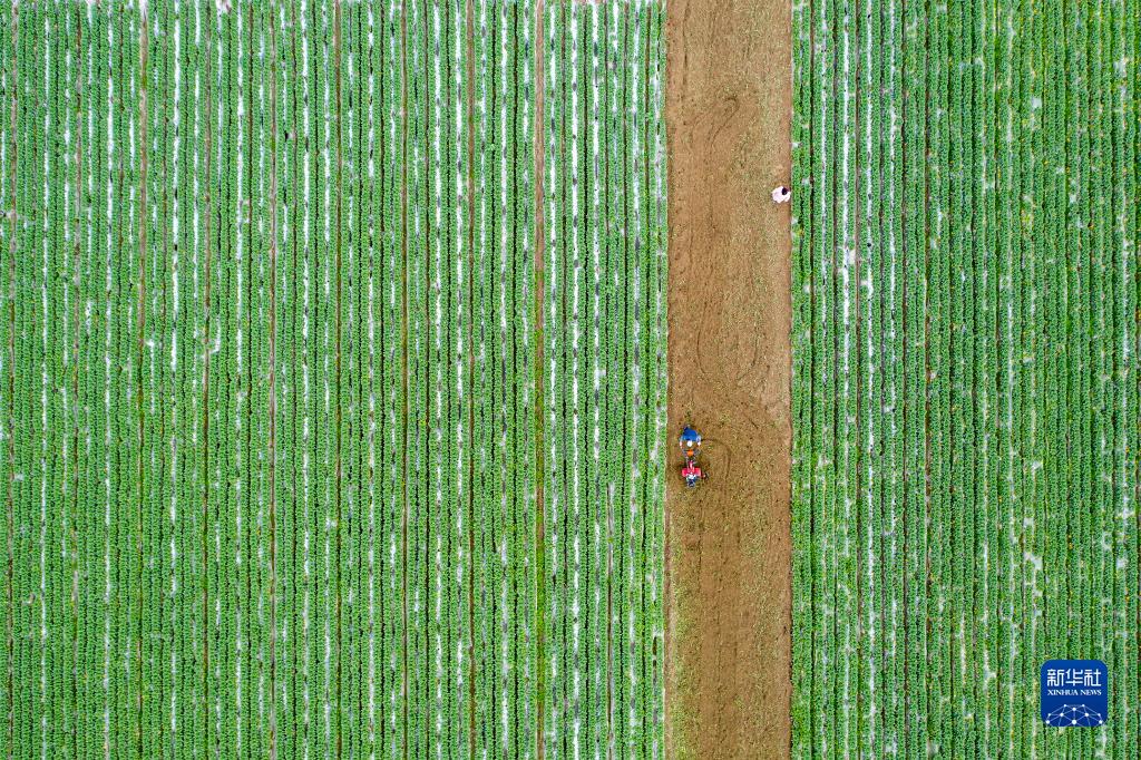 在四川省閬中市彭城鎮(zhèn),村民駕駛農機翻耕菜地(2月23日攝,無人機照片)。新華社發(fā)(王玉貴 攝)
