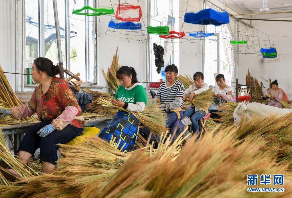 婦女在內蒙古巴林左旗林東鎮(zhèn)扶貧車間內制作笤帚(2019年8月5日攝)。新華社記者 彭源 攝
