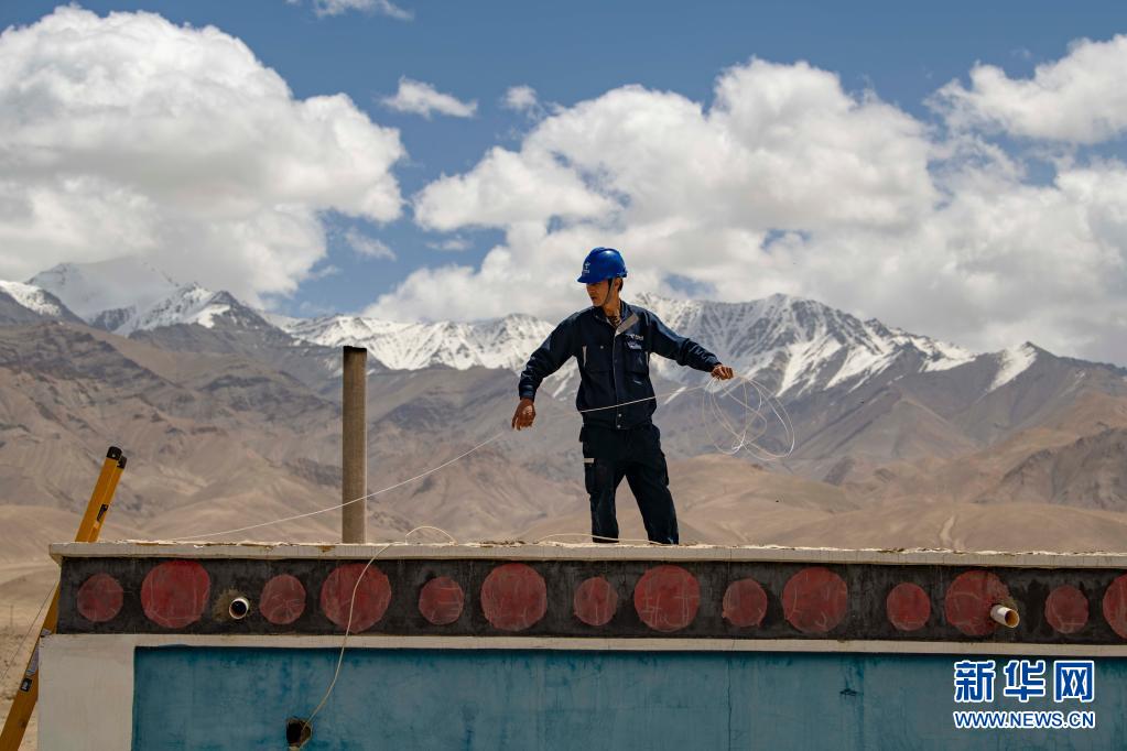 在新疆喀什地區(qū)塔什庫爾干塔吉克自治縣,工作人員為當地農戶鋪設入戶光纖(2020年6月10日攝)。新華社記者 胡虎虎 攝